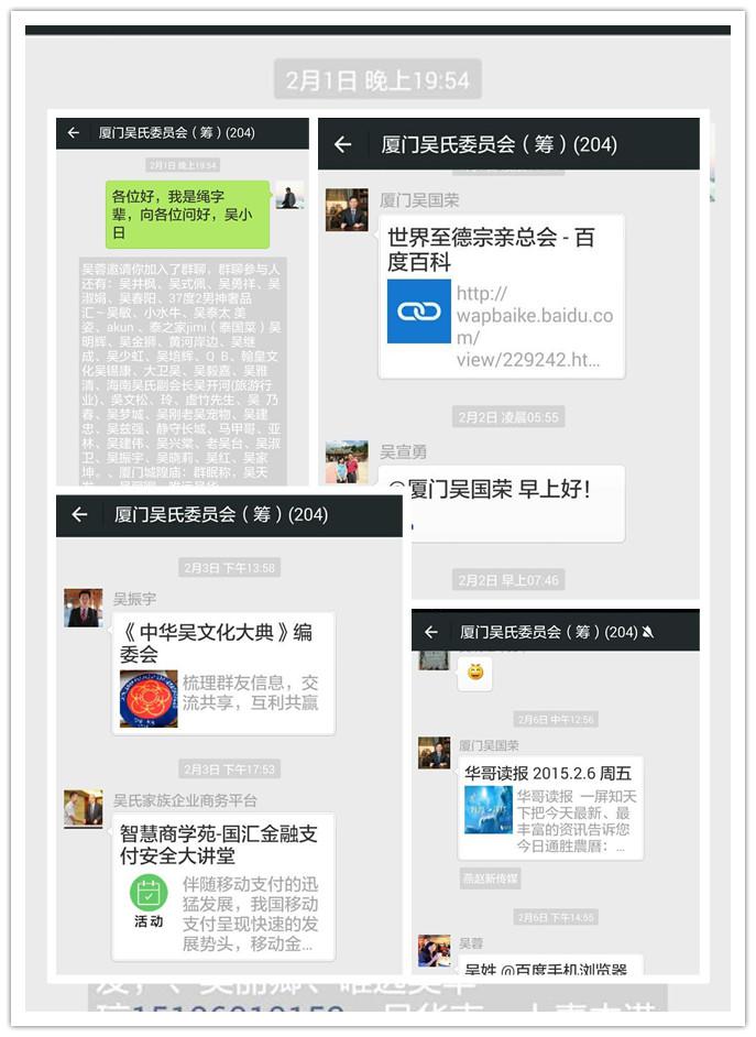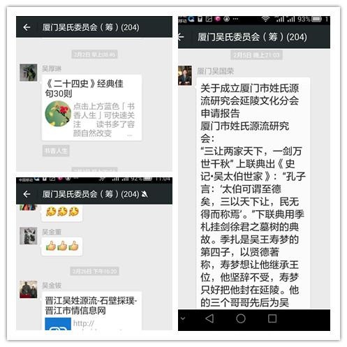 2015年初,吴国荣宗亲在厦门发起了吴氏委员会筹备群。并开始了与在厦门宗亲的沟通,交流。在微信群中宣传吴文化,宗亲们也开始了对吴氏先祖的认识。相互交流相关的吴文化,国学资料。并不断的将在厦门的宗亲推荐入群。也通过在微信的交流相互认识,开始交流,互访。并开始有筹备组的雏形,一批骨干人员踊跃参与。